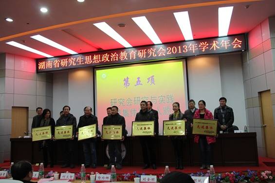 曾力勤部长宣读了《关于表彰2013 年湖南省研究生思想政治教育研究与实践先进集体、先进个人的决定》。我校等7个单位被评为“湖南省研究生思想政治教育研究与实践先进集体”,我校教育学院党委副书记王伟清、研究生学院(部)明鸿桢等27人被评为“湖南省研究生思想政治教育研究与实践先进个人”。2012-2013年我校连续两年获评“湖南省研究生思想政治教育研究与实践先进集体”。