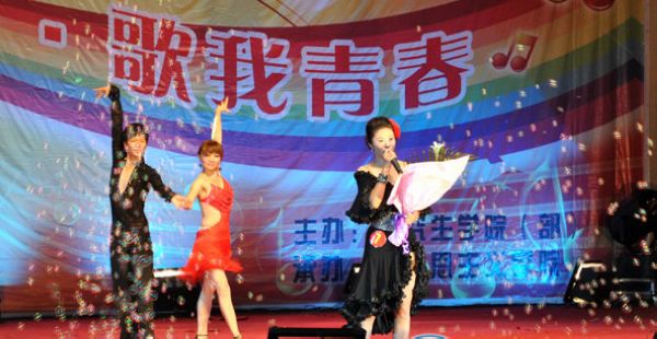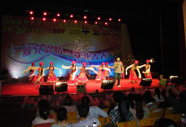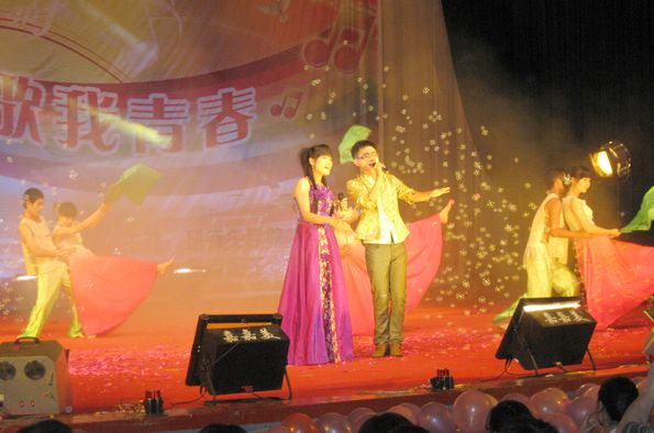 在热烈欢庆的欢呼倒计声中,晚会缓缓地拉开序幕。缓缓的音乐、优美的舞蹈、油纸伞,外国语学院的同学们集体演绎仿佛把我们带到了《小城雨巷》。“十佳歌手”总决赛十位选手用不同的声音、不同的风格唱着各自的青春故事。第一位选手刘旋用豪迈和响亮的歌手唱《海阔天空》,刘明杨甜美的海豚音诉说她《一个真实的故事》,刘晓峰用浑厚有力地声音把一曲《月亮惹的祸》的深情演绎地淋漓尽致,感情真挚,打动了在场的所有观众。钱宁的一首《卓玛》把我们带到了草原,看那草原的姑娘卓玛和那美丽的格桑花。《荷塘月色》在歌手吕译扎实的演唱功底和伴舞人员绝妙的配合下,赢得了在场观众数次的掌声和欢呼声。整场晚会的气氛一浪高过一浪,他们倾情演唱与激情舞蹈为六月的毕业生晚会送上了一场视听盛宴。