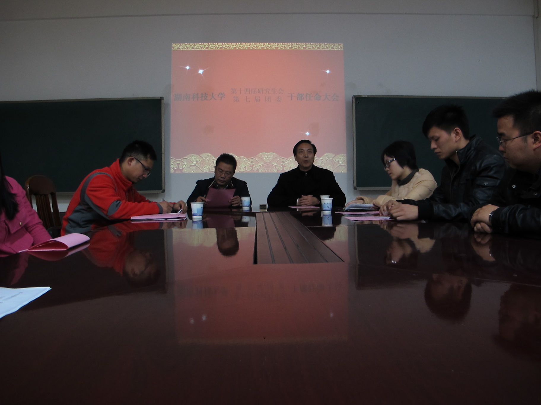 2013年12月12日下午,湖南科技大学第十四届研究生会、第七届研究生团委干部任命大会在逸夫楼501会议室举行。研究生工作部刘金明部长,研究生工作部胡斌梁副部长,思想教育与管理办公室杨骐玮主任与刘俪喆老师出席会议。与会的还有第十四届研究生会、第七届研究生团委所有干部以及各学院研究生分会主席。会议由新任团委副书记汤亚主持。