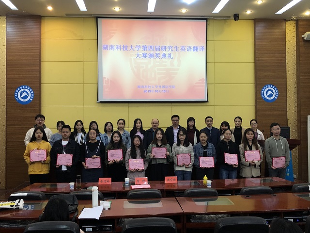 10月15日下午,湖南科技大学第四届研究生英语翻译大赛颁奖典礼于外语楼101会议室隆重举行。外国语学院院长张景华、书记周启强、副院长禹玲、尚巾斌副教授、官科博士、刘迎姣老师受邀出席,参加本次颁奖典礼的还有外国语学院2019级全体研究生以及其他学院获奖选手。
