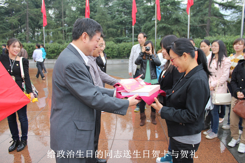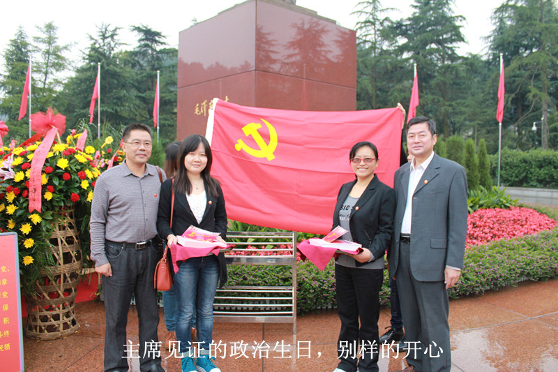 在毛主席铜像广场,我们还给两位入党十周年的党员过政治生日。副书记周文革和研究生学院副院长胡斌梁给两位政治生日的同志送上生日贺卡与生日礼物。从两位同志灿烂的笑脸中大家感受到了她们在主席见证下过政治生日的开心与激动。