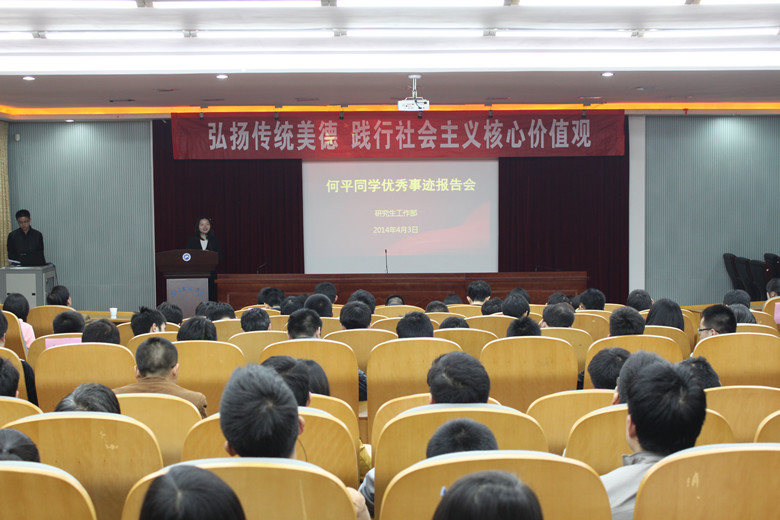 为了贯彻落实党的十八大精神,积极培育和践行社会主义核心价值观,使广大研究生学有榜样、行有示范,为群众路线教育实践活动深入开展凝聚正能量,研究生工作部于4月3日晚上7:30在三教101教室举行“弘扬传统美德,践行社会主义核心价值观”——何平同学优秀事迹报告会。研究生工作部刘金明部长、胡斌梁副部长、思想教育与管理办公室杨骐玮主任和刘俪喆老师、全体研究生干部、以及各学院研究生代表共300余人参加了此次报告会。报告会由研究生团委副书记汤亚主持。