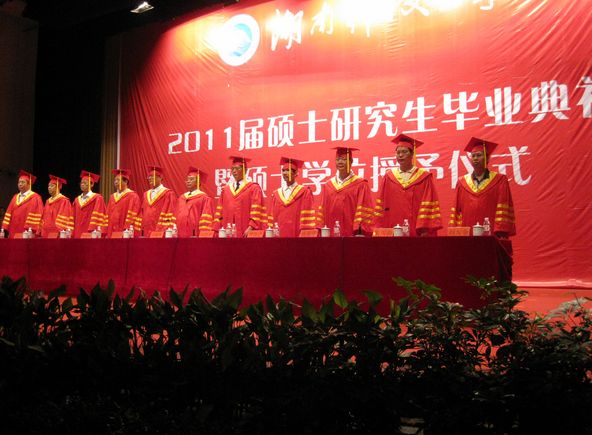 2011年6月21日上午9:30,湖南科技大学2011届硕士研究生毕业典礼暨学位授予仪式在南校俱乐部隆重举行。我校2011届全体硕士毕业生穿着整齐的硕士服,参加此次毕业典礼暨学位授予仪式。仪式由校长刘德顺主持。