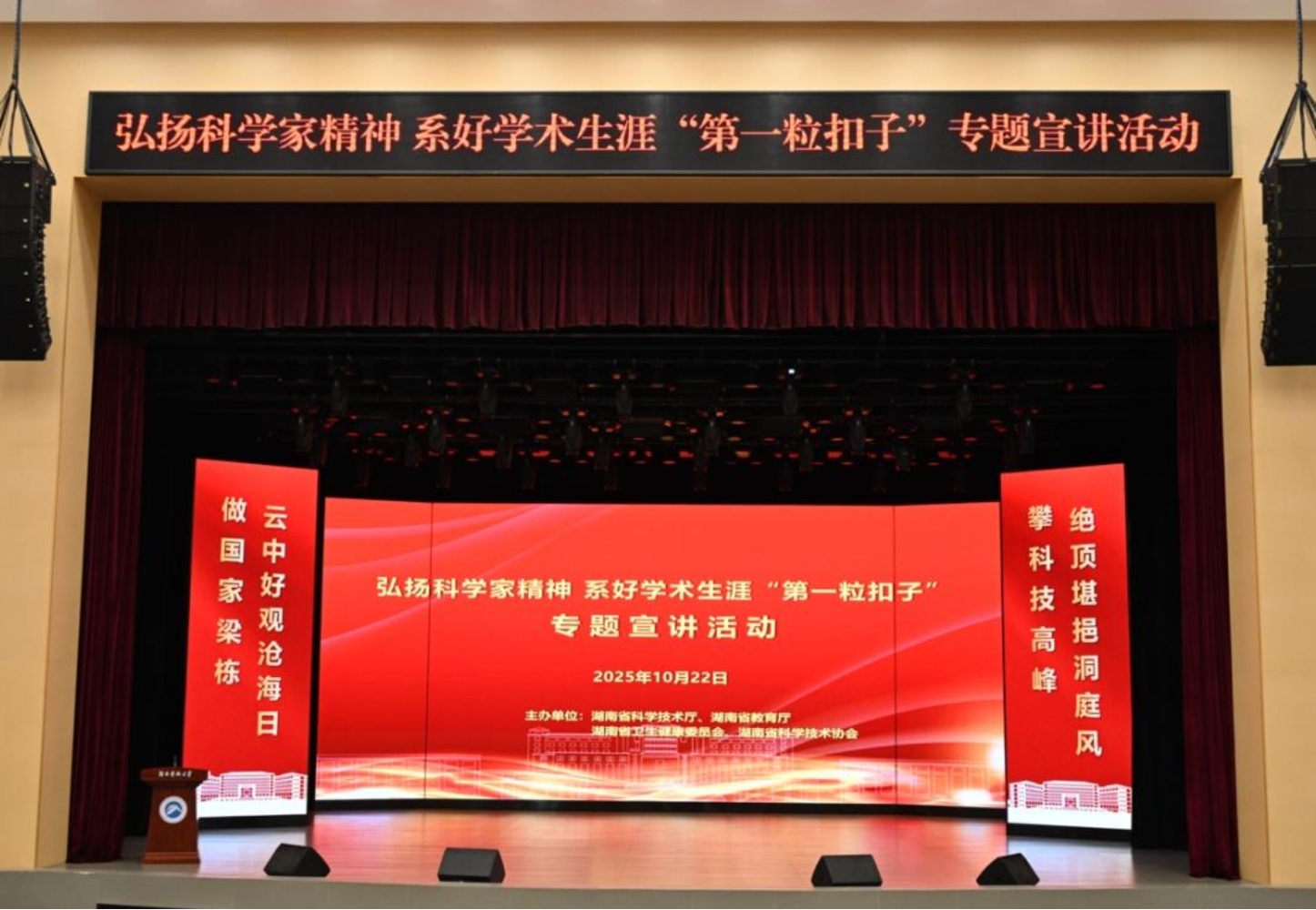 朱皖在发言中强调了科研生态的重要性,并分享三点体会:一是弘扬科学家精神,以楷模为榜样投身创新;二是坚守科研诚信,杜绝学术不端,完善监管体系;三是把握湖南科创政策机遇,鼓励青年学子将个人追求融入大局,医务工作者以科技创新护佑健康。最后,朱皖表达了对此次宣讲活动的认可,也表达了对每一位学子最真挚的祝福。