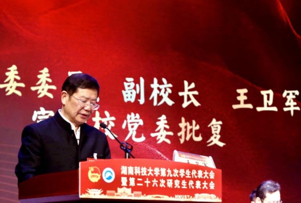 王卫军宣读湖南科技大学党委《关于同意召开湖南科技大学第九次学生代表大会暨第二十六次研究生代表大会的批复》。