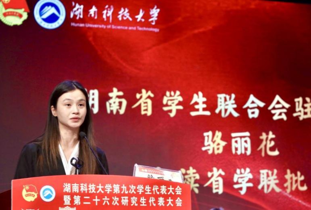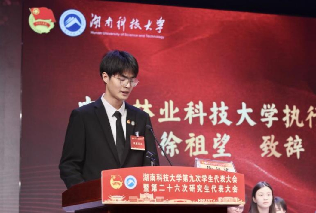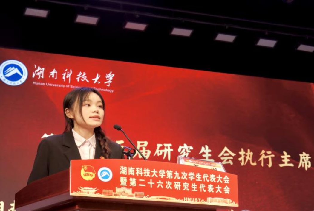 第二十五届研究生会执行主席贺璇代表湖南科技大学第二十五届研究生会向大会作主题为“凝心聚力践初心,青春建功向未来,为建设高水平综合性大学贡献智慧力量”的工作报告。报告总结过去一年来校研究生会在思想引领、学术创新、成长服务、精细管理与组织革新五大领域收获扎实成效。未来,研究生会将继续践行服务同学宗旨、凝聚青春合力,以实干助力研究生教育高质量发展,用青春才智赋能国家发展,践行青年担当。