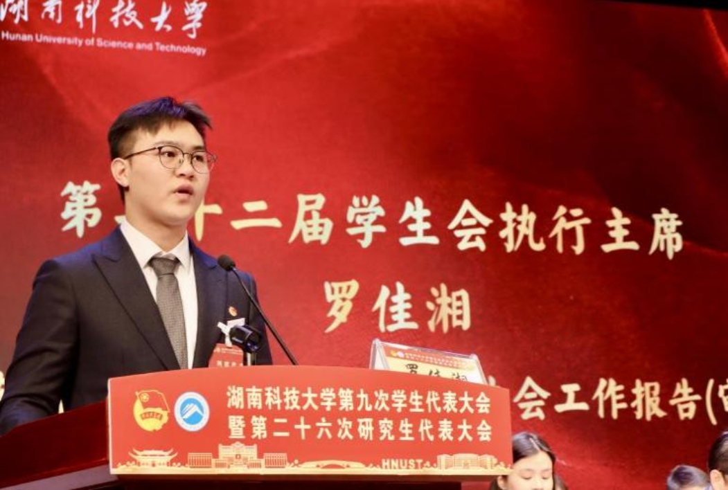 第二十二届学生会执行主席罗佳湘代表湖南科技大学第二十二届学生会作主题为“以挺膺之姿投身伟大实践,用接续奋斗谱写青春华章”的工作报告。报告总结过去一年校学生会在思想引领、成长服务、文化繁荣与实践创新四个方面取得的成绩,并明确未来将持续强化思想政治引领、优化内部治理体系、践行服务宗旨、坚守文化育人特色,号召全体同学接续奋斗,书写青春华章。