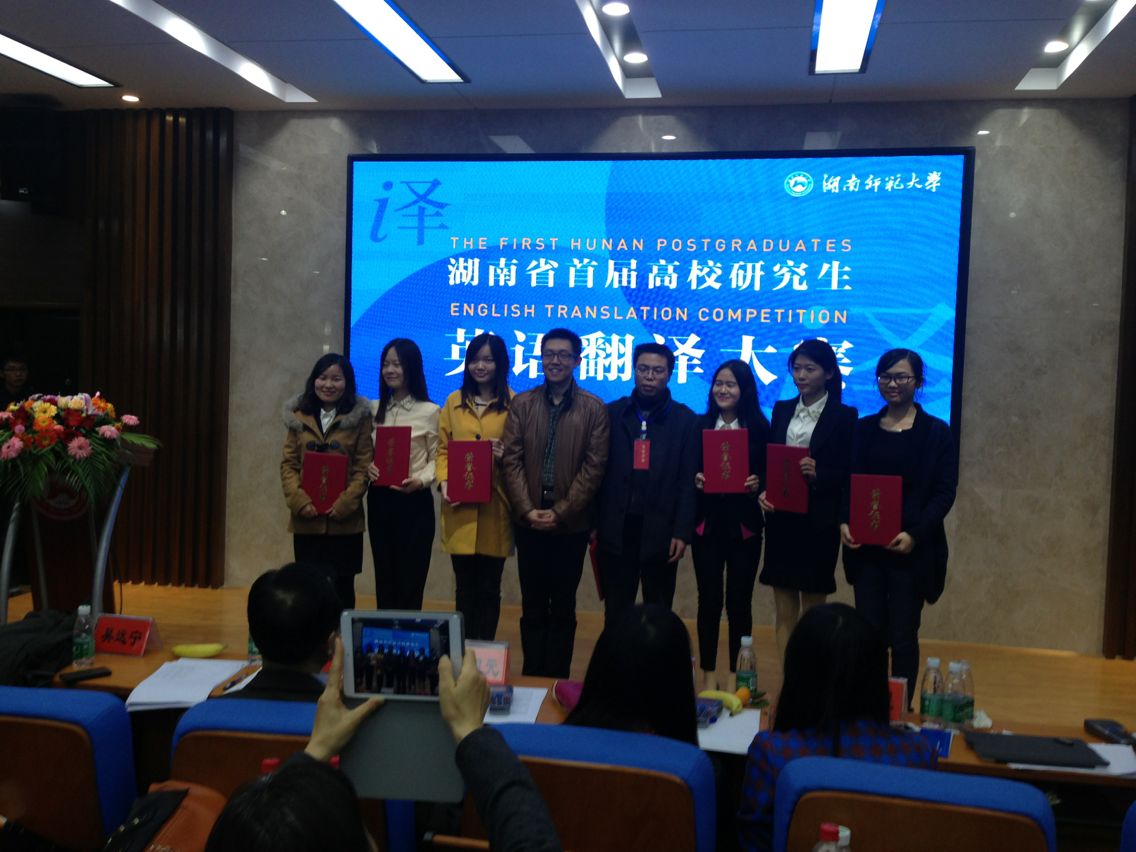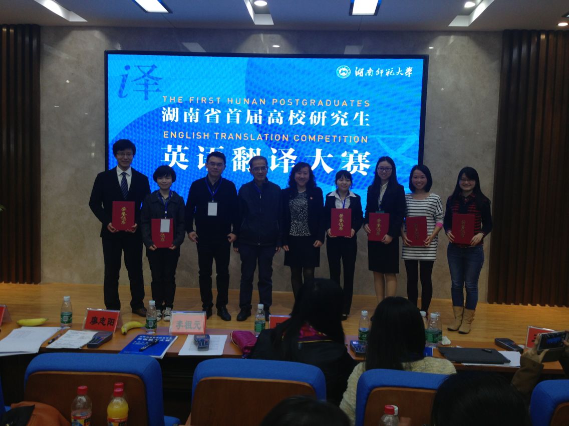 11月22日,湖南省首届高校研究生英语翻译大赛在湖南师范大学拉开帷幕。经过激烈的角逐,我校外国语学院研究生程玲玲同学在笔译比赛中排名第三,斩获二等奖,沙小叶同学喜获口译比赛优胜奖。