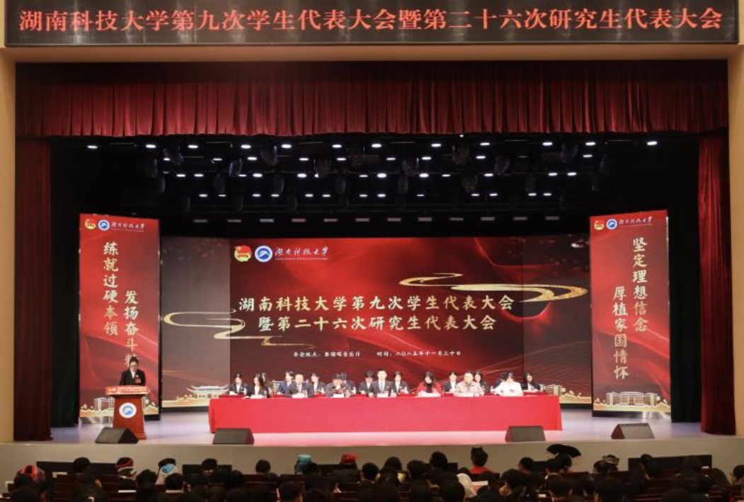 2025年11月30日上午,湖南科技大学第九次学生代表大会暨第二十六次研究生代表大会在黎锦晖音乐厅顺利召开。校党委委员、副校长王卫军,校党委委员、副校长赵前程出席。我校各职能部门负责人,各教学院党委副书记、团委书记,校团委和党委研究生工作部全体人员以及大会列席代表、特邀代表、正式代表以及10余所兄弟高校的师生代表等参加会议。会议由第二十三届学生会主席团成员施维雅主持。