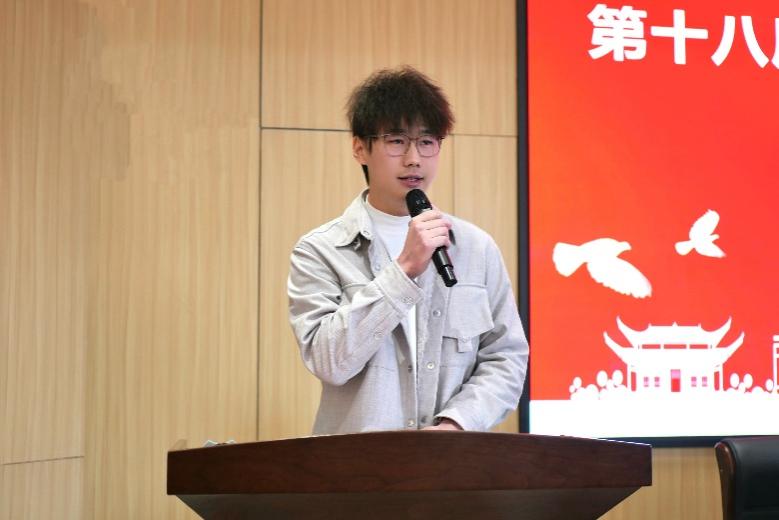 第十八届研究生团委副书记蔡晨龙以“沉淀、连接、开拓”三个关键词总结了过去一年的工作收获,并对新一届成员提出建议。