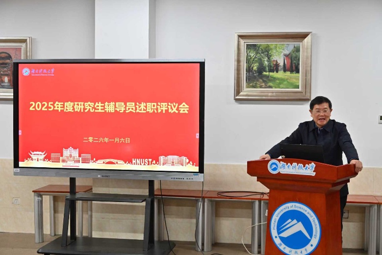 为进一步加强研究生辅导员队伍专业化、职业化建设,激发研究生辅导员队伍活力,提升研究生教育管理能力与服务水平,1月6日下午,学校在立德楼417会议室举行2025年度研究生辅导员述职评议会。校党委委员、副校长王卫军,党政办公室、宣传统战部、人事处、研究生院(研究生工作部)、学生工作部、保卫部、团委等相关职能部门领导担任评委。述职评议会由党委研究生工作部副部长、研究生院副院长邹平辉主持。
